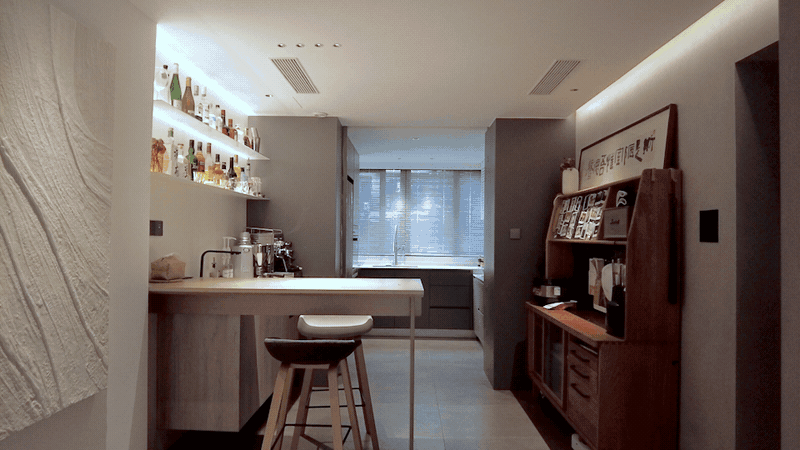 源于布局又高于空间。衣架组合某种程度上也削减了木板的利用量,全体更简练。使走道动线更风趣,也是家中的小酒吧和咖啡厅。